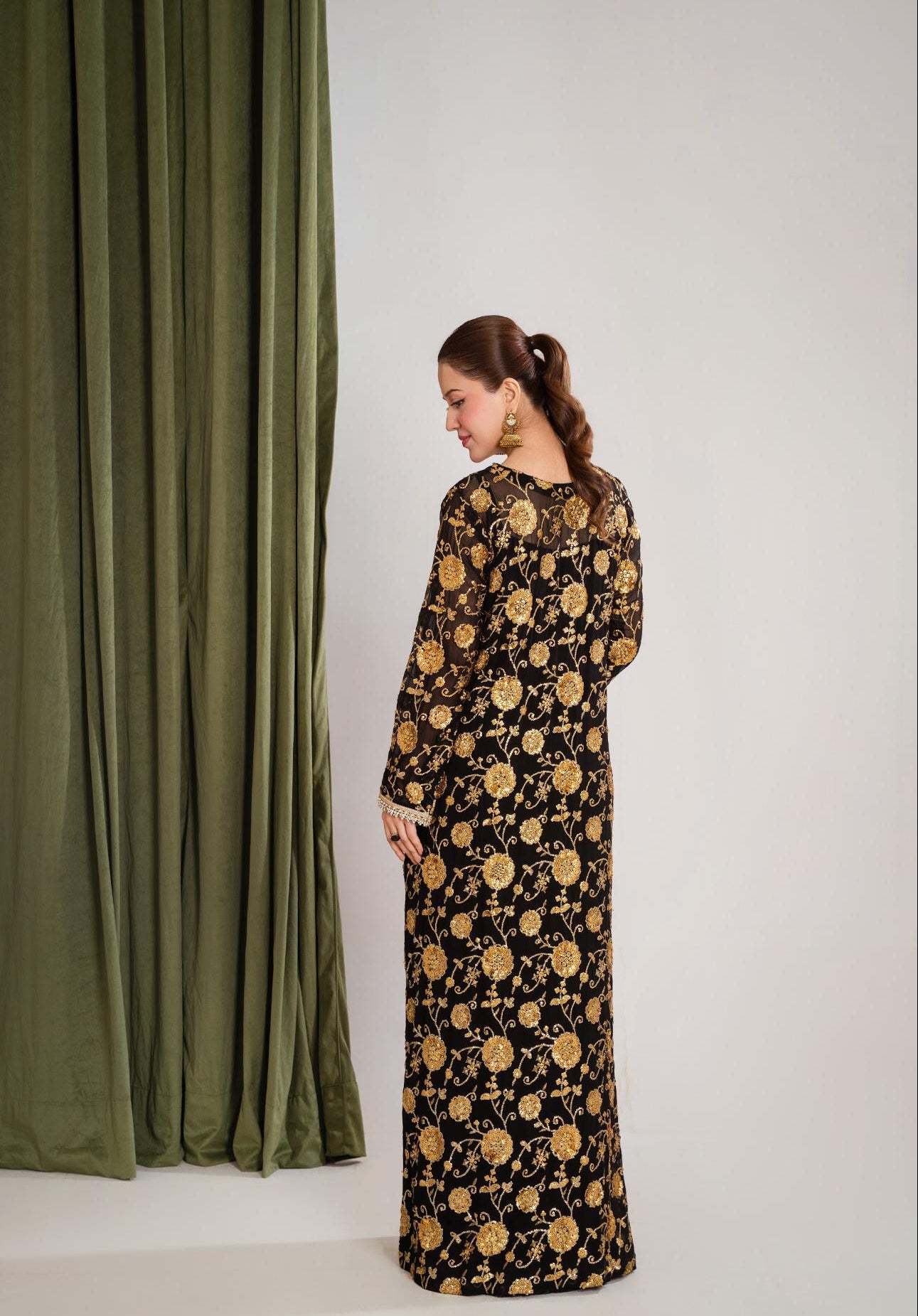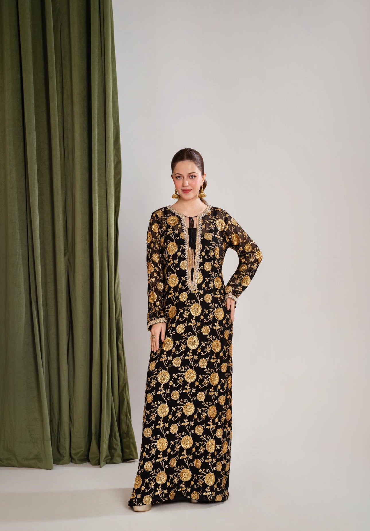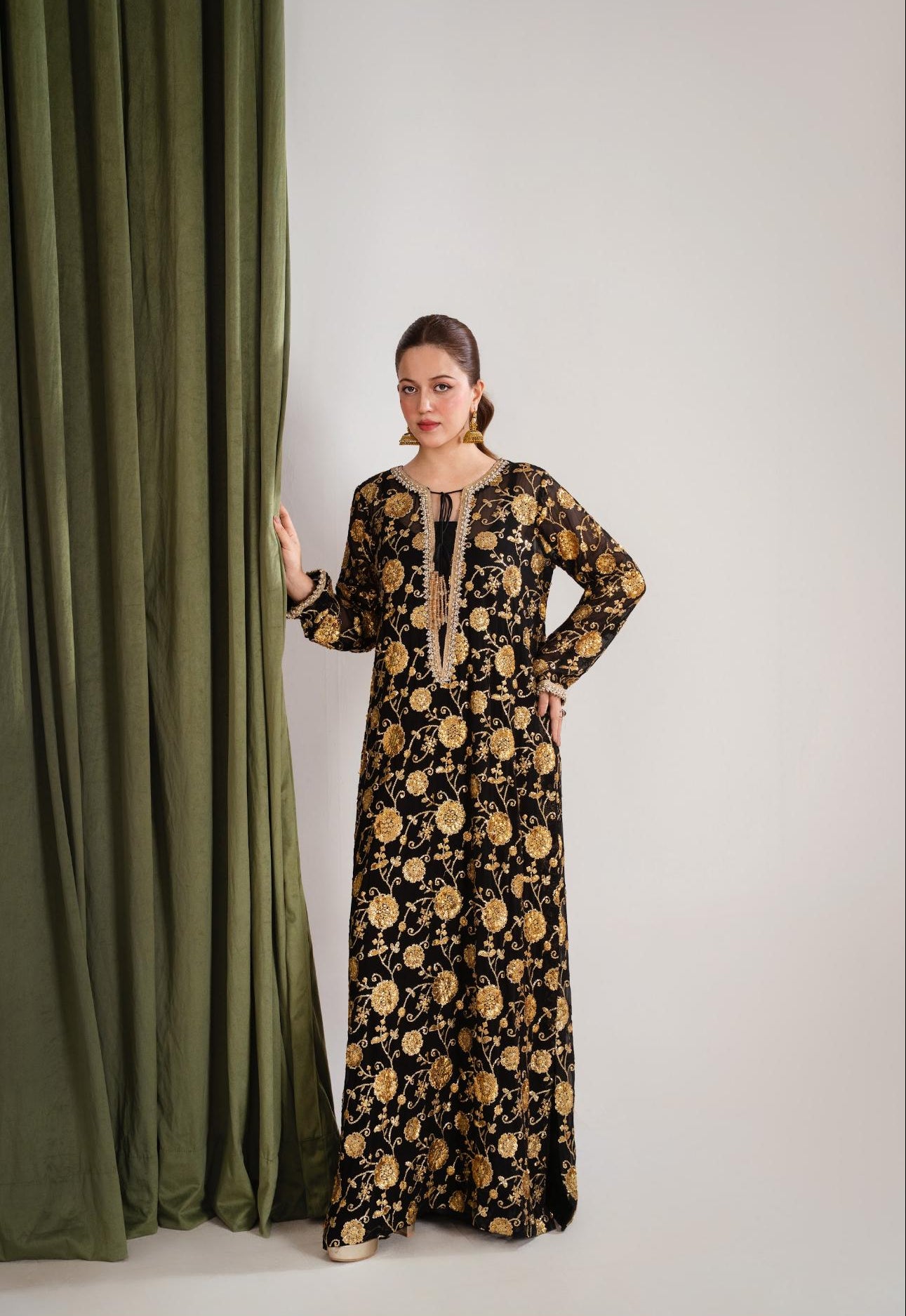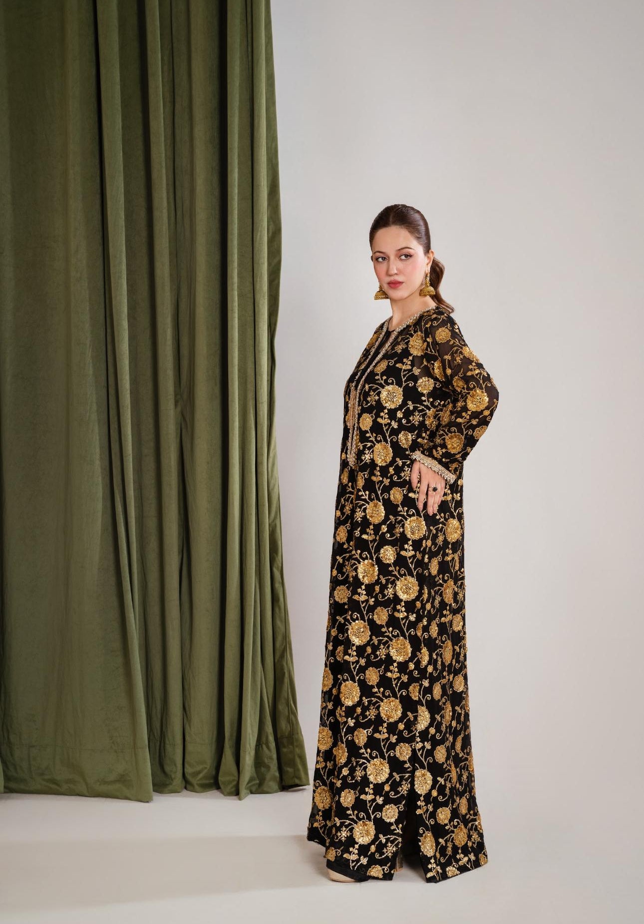 Alaya Black presents a sophisticated fusion of traditional and contemporary silhouettes. Crafted from flowing chiffon, this kaftan features elegant cigarette pants that provide a sleek, tailored foundation beneath the garment's graceful drape. Strategic slits along the sides enhance movement while maintaining refined proportions, creating a versatile piece suitable for both casual gatherings and formal occasions. The lightweight chiffon ensures comfort in warmer climates, while the structured pants offer a polished aesthetic. This design exemplifies modern modest fashion, balancing volume with definition for an effortlessly elegant appearance.