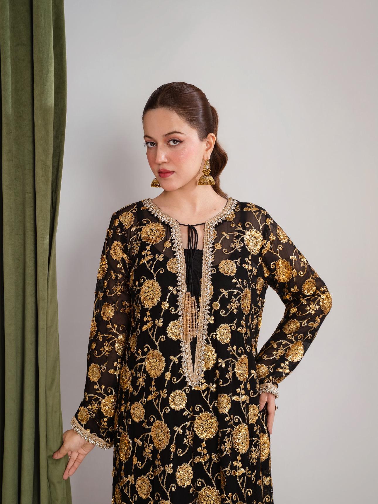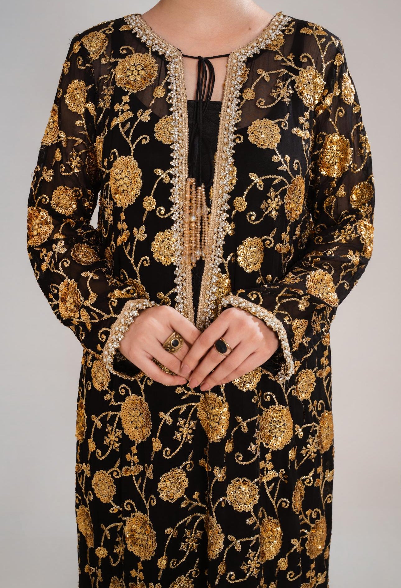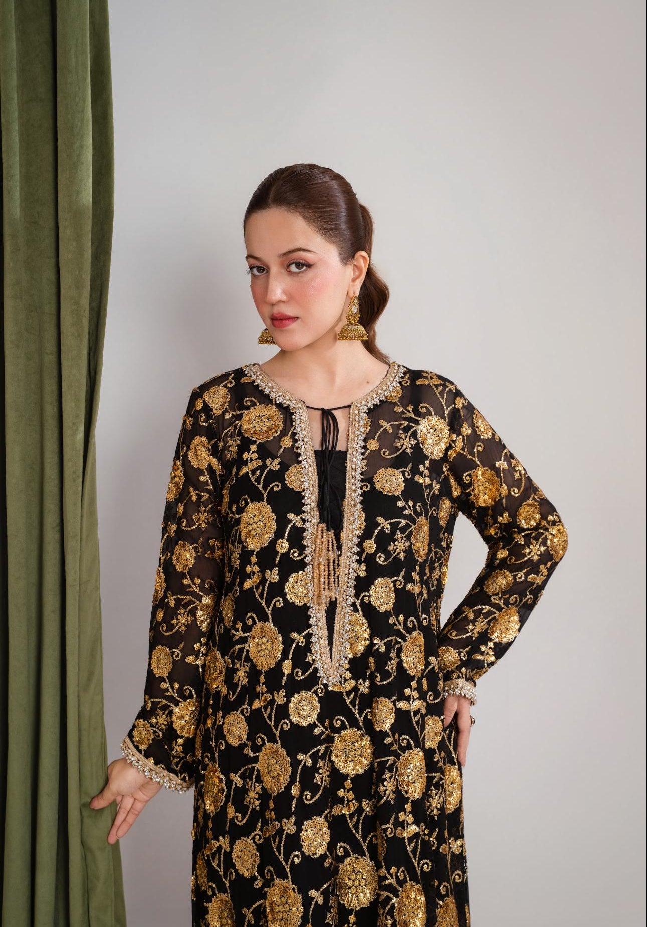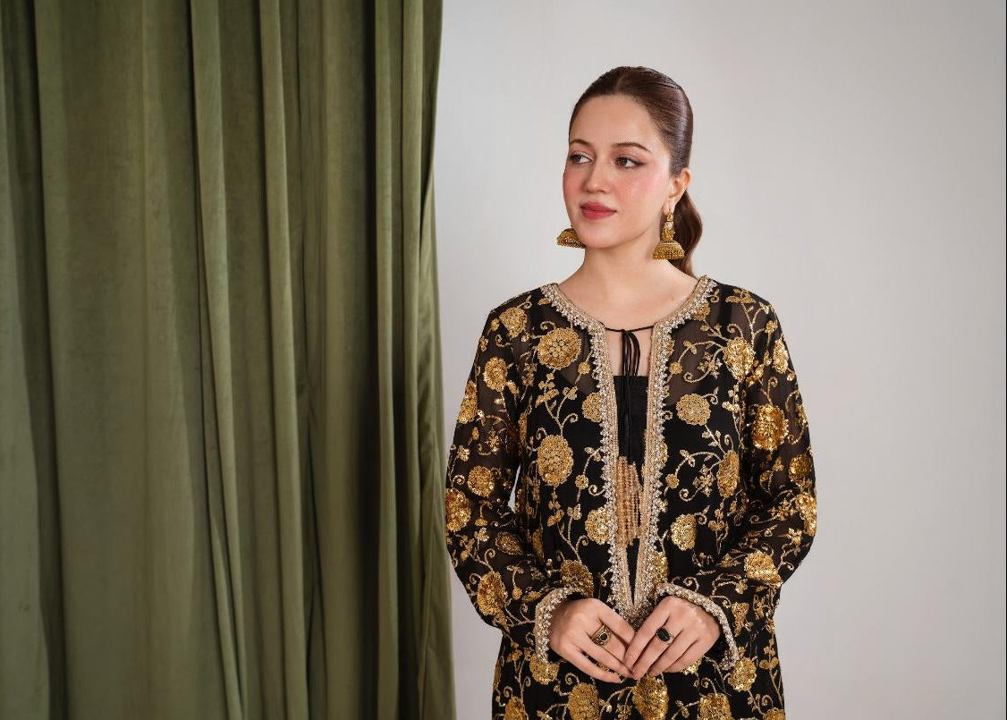 Alaya Black presents a sophisticated fusion of traditional and contemporary silhouettes. Crafted from flowing chiffon, this kaftan features elegant cigarette pants that provide a sleek, tailored foundation beneath the garment's graceful drape. Strategic slits along the sides enhance movement while maintaining refined proportions, creating a versatile piece suitable for both casual gatherings and formal occasions. The lightweight chiffon ensures comfort in warmer climates, while the structured pants offer a polished aesthetic. This design exemplifies modern modest fashion, balancing volume with definition for an effortlessly elegant appearance.