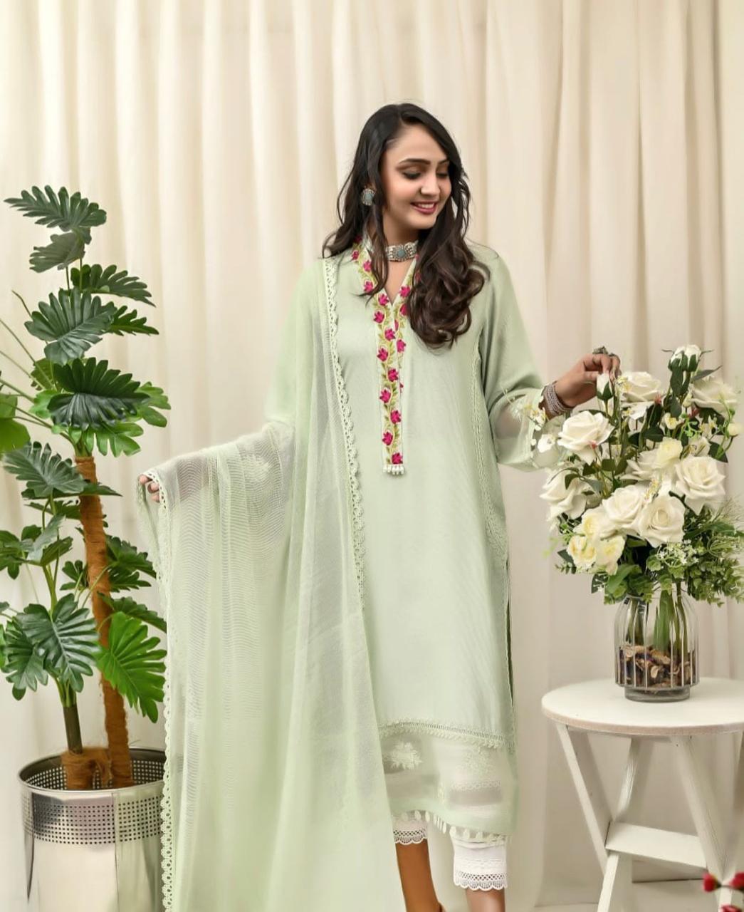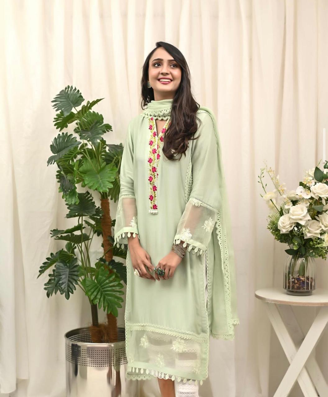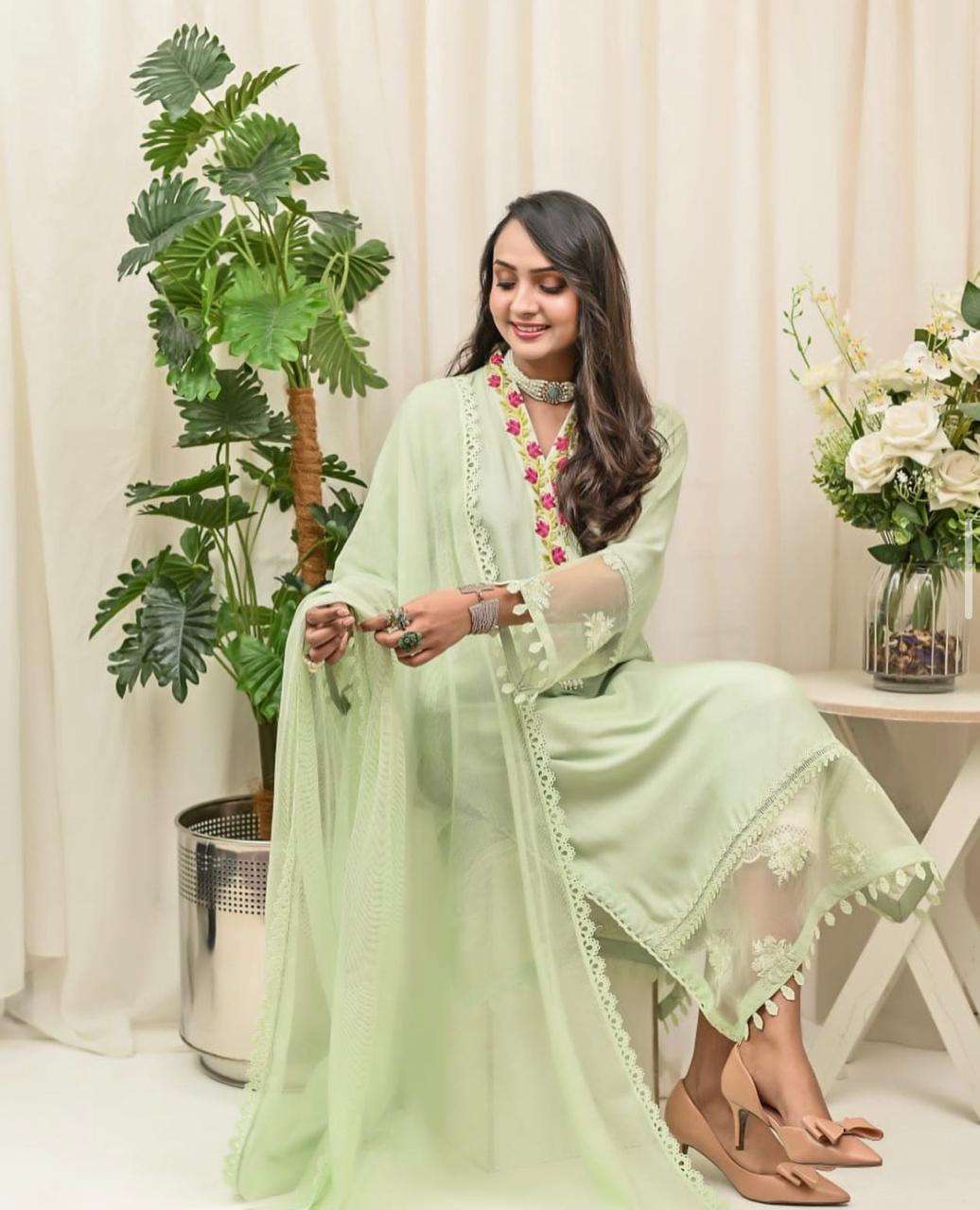 Experience effortless elegance with this stunning mint green cotton net shirt, beautifully embellished with intricate silk thread embroidery and crochet lace detailing. Complete your look with this perfect solid outfit featuring delicate laces and a beautifully embroidered organza panel with pleats. Perfect for any occasion, this ensemble is a true embodiment of timeless style. Pair it with out Khaddi Net Dupatta