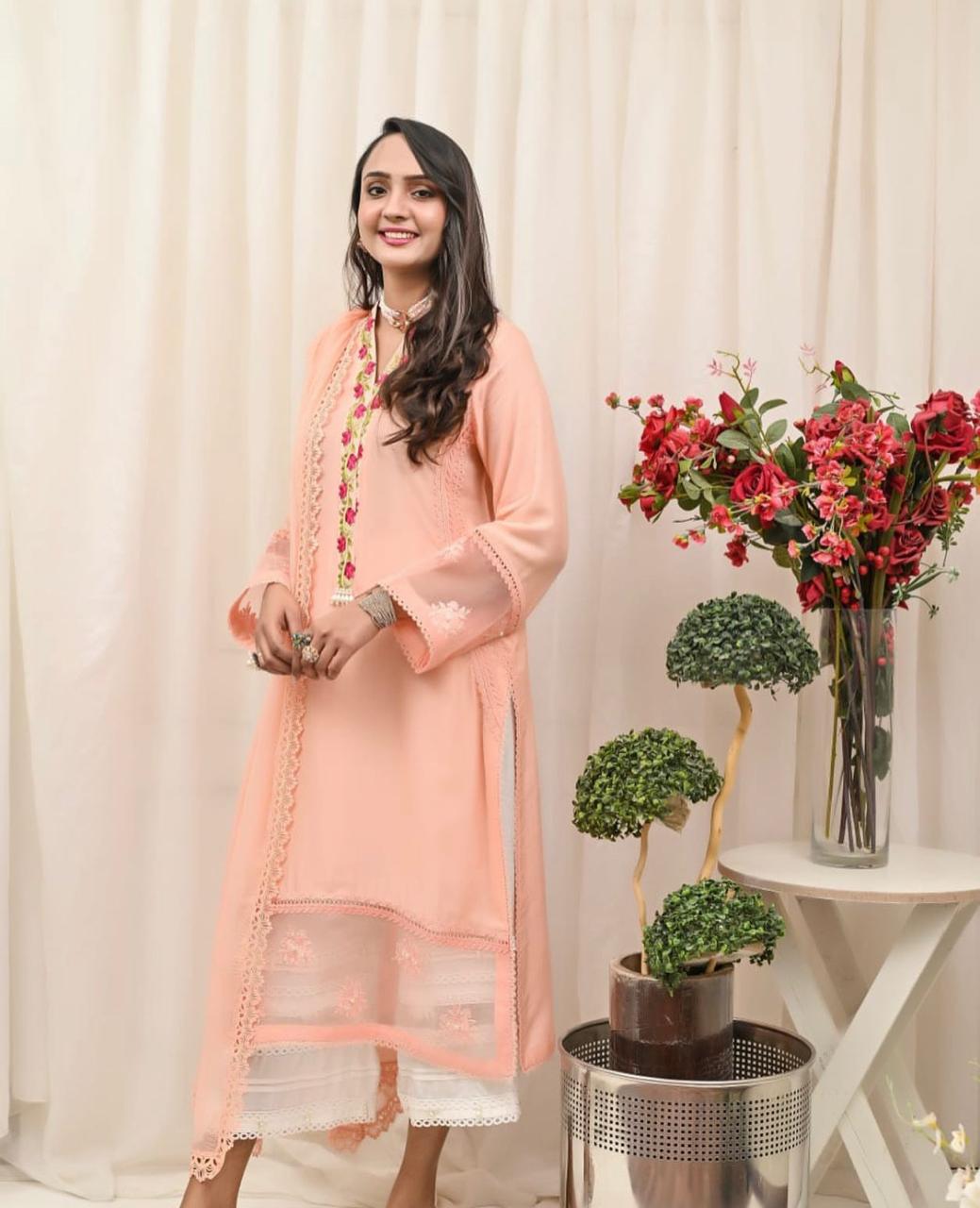 Introducing Neha - From our latest Eid Festive Solid collection featuring a stunning long silhouette cotton net shirt in a gorgeous shade of peach, adorned with intricate silk thread embroidery and crochet laces, creating a unique and stunning pattern. Beautifully crafted laces and an embroidered organza panel, incorporated with pleats, to complete your sophisticated and stylish look. Experience luxury and elegance like never before with Neha.